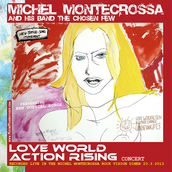 ‘Love World Action Rising’ released by Mira Sound Germany as Audio-CD and DVD, is Michel Montecrossa’s third Concert of his ‘Love World Action & Climate Change Concert Tour 2013’ with New Topical Songs about finding a new German chancellor and a meaningful future, performed in the Michel Montecrossa Rock Vision Diner on 23rd March 2013 together with Mirakali, presenting 31 acoustic and electric New-Topical & Cyberrock Songs including ‘Talking Love World Action’, ‘Talking Love World Never Ending’, ‘Talking The Pope Needed’, ‘Talking New German Chancellor’, ‘Talking German Wahlgetoese, Or ‘Who Is The Clown?”, ‘Talking The German Chancellor I Want’, ‘Talking Love World Action For A Better Future’, ‘Love To See, Love To Feel’, ‘Punk Kid #2’ and ‘Best Choice’.