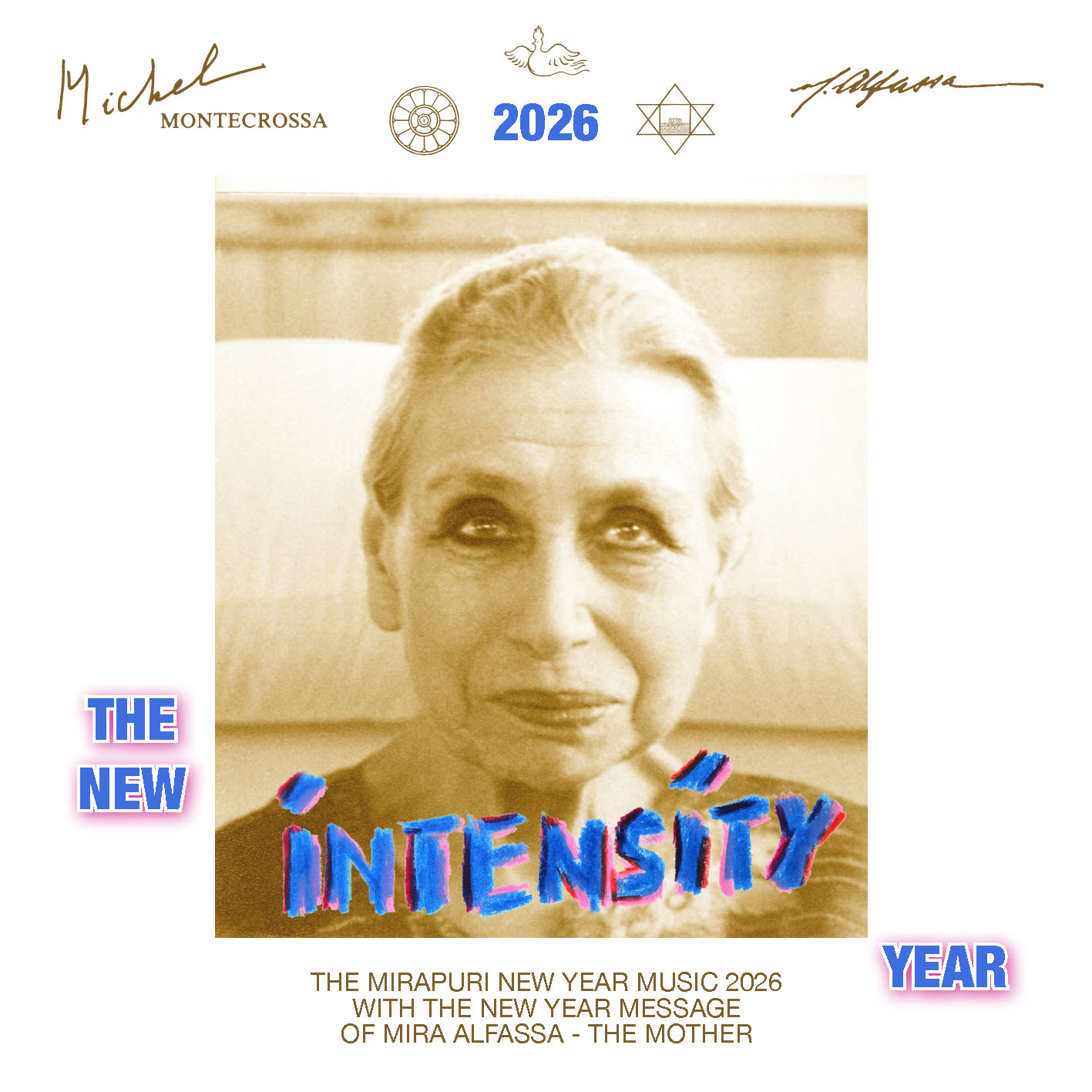 The Mirapuri NEW YEAR MUSIC 2026 with the title ‘2026 THE NEW INTENSITY YEAR’ features the New Year Intensity Message spoken in French by Mira Alfassa – The Mother, in English by Michel Montecrossa and in German by Mirakali, followed by the symphonic meditation music of Michel Montecrossa.