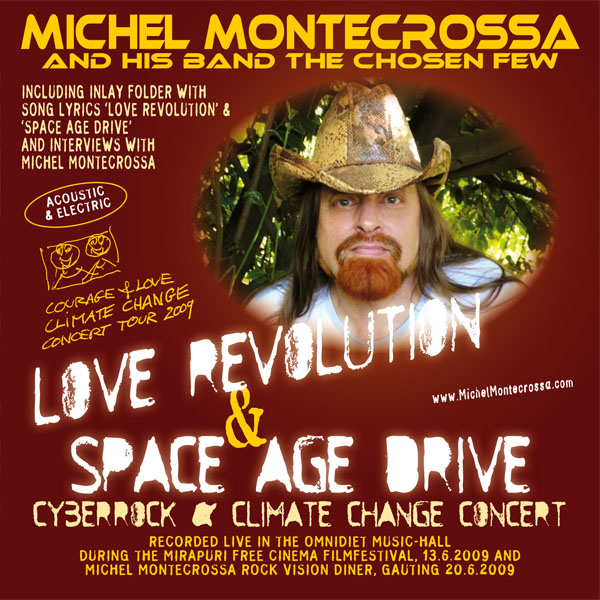 The ‘Love Revolution & Space Age Drive’ Cyberrock & Climate Change Concert, released by Mira Sound Germany as double Audio-CD and DVD are Michel Montecrossa’s eleventh and twelfth message concerts of the Courage & Love Climate Change Concert Tour 2009 presenting 33 songs, including the title song ‘Love Revolution’ and great rock songs like ‘Suck It Out’, ‘Exploring The Universe’, ‘Logo-Girl’ and the profound electro-acoustic version of ‘We Are The Others’.