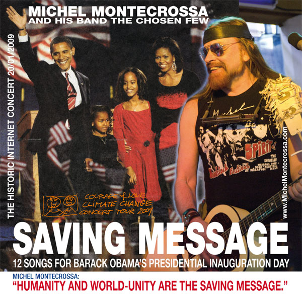 ‘Saving Message’ is Michel Montecrossa’s historic opening concert of the Courage & Love Climate Change Concert Tour 2009 presenting 12 songs inspired by Barack Obama’s presidential inauguration on 20/01/2009. Released by Mira Sound Germany as Audio-CD and DVD it includes the songs: