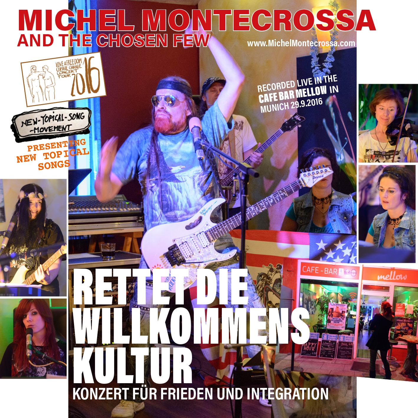 ‘Rettet Die Willkommens Kultur’ New-Topical-Song Concert for Peace and Integration by Michel Montecrossa and his band The Chosen Few, released by Mira Sound Germany on Audio-CD, DVD and as Download, is a strong humanitarian concert by Michel Montecrossa and his band The Chosen Few live at Cafe Bar Mellow in Munich, Germany on 29th September 2016.