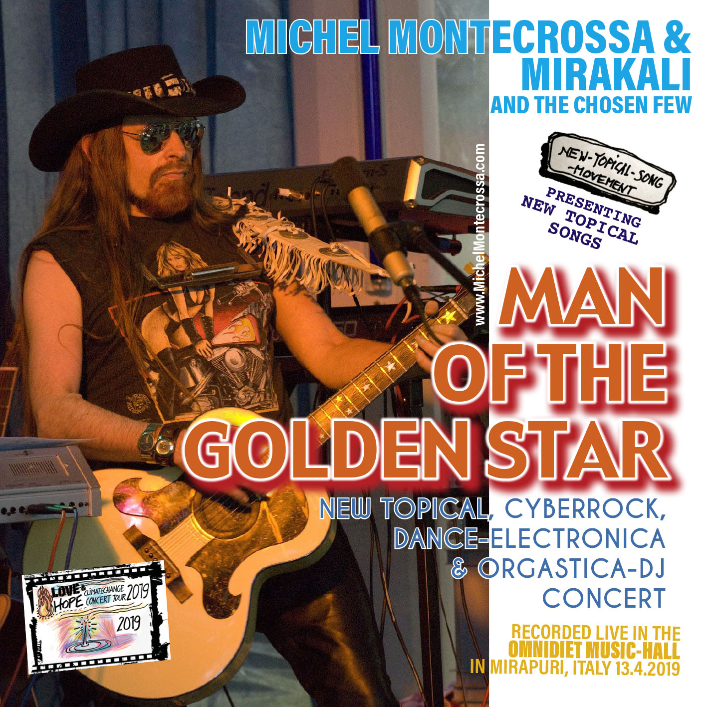 ‘Man Of The Golden Star’ New-Topical, Cyberrock, Dance-Electronica & Orgastica-DJ Concert by Michel Montecrossa and Mirakali in the Omnidiet Music-Hall in Mirapuri on 13th April 2019, featuring Michel Montecrossa’s energy of Cyberrock Songs and Mirakali’s exciting Orgastica-DJ Instrumentals that go along with the recitations of her expressive Zen-Style Cyberpoems. The concert is released by Mira Sound Germany on Audio-CD, DVD and as Download and presents 25 great songs by Michel Montecrossa and Mirakali including: ‘Man Of The Golden Star’, ‘The Sunrevolution Song Of Love & Hope’, ‘Every Day For Future’, ‘The Night Is Not Dark’, ‘Humans And Cybers’, ‘Ridin’ Wild – Naked And In Leather’, ‘Lovefire’, ‘Saturday Night Rock #2’, ‘Summersong’, ‘Living On A Planet’ and many more.