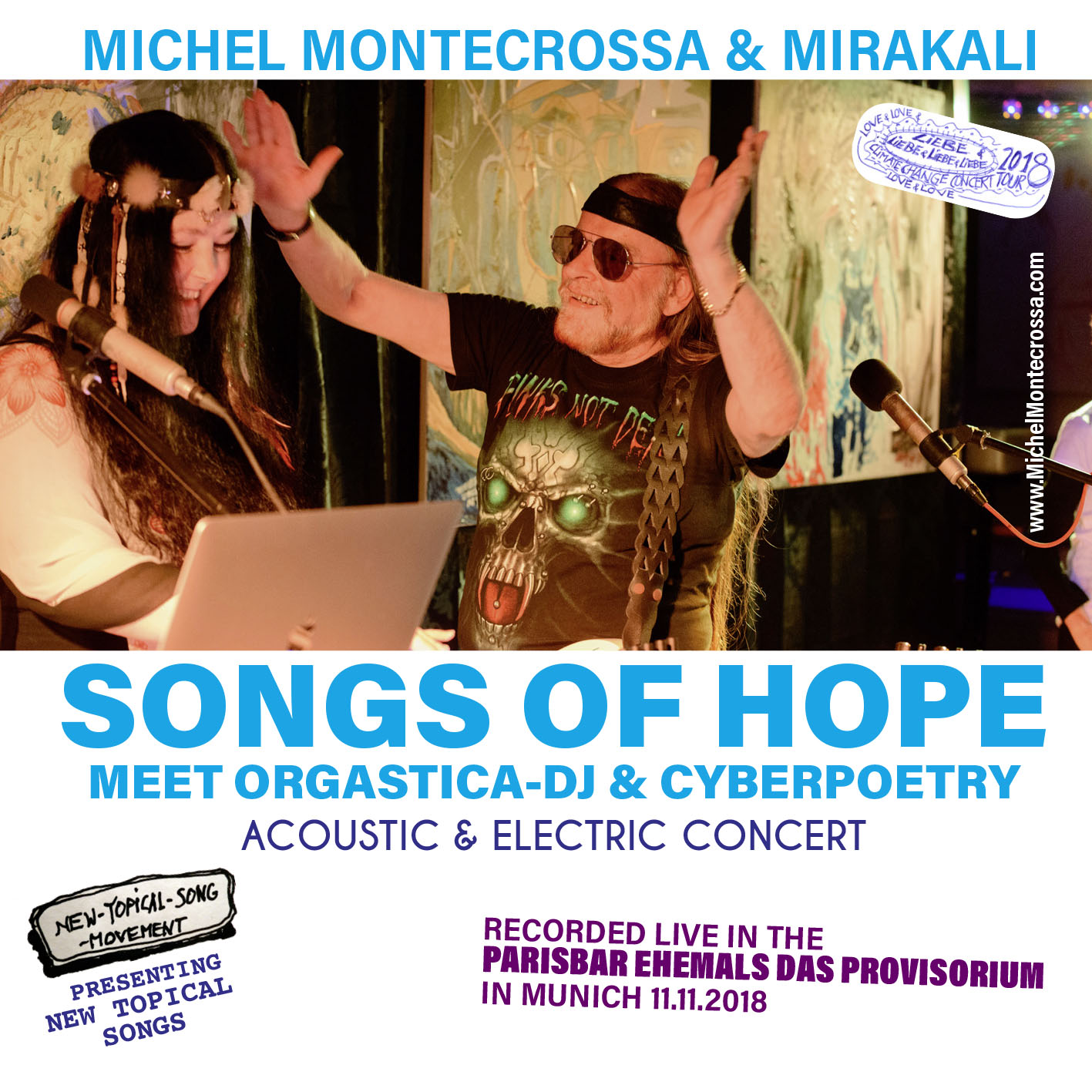 ‘Songs of Hope meet Orgastica-DJ & Cyberpoetry’ is the title of the grand Acoustic & Electronica Concert by Michel Montecrossa and Mirakali in the ‘Parisbar ehemals Das Provisorium’, in Munich on 11th November 2018, released by Mira Sound Germany on Audio-CD, DVD and as Download.