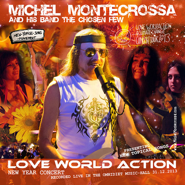 ‘Love World Action’ released by Mira Sound Germany as Audio-CD and DVD, is Michel Montecrossa’s New Year Concert with uplifting Topical Songs about the way to Love and Unity, performed in the Omnidiet Music Hall on 31st December 2012 – 1st January 2013 together with Mirakali, presenting 31 New-Topical & Cyberrock Songs including the ‘Concert Tour & Festivals 2013 Introduction’, ‘Brothers And Sisters Of Love’, ‘Never Too Late’, ‘Love And Unity Smile’, ‘Lovetrain’, ‘The Solution Is My Baby’, ‘Country Baby’, ‘Rescue Mission’, ‘Something Beautiful’, ‘Sweet Magic’, ‘Mysterious Earth’, ‘Angel Nation’, ‘Love Is The Savior!’, ‘Wideness, Freedom, Bliss’, ‘Love World Action Song’.