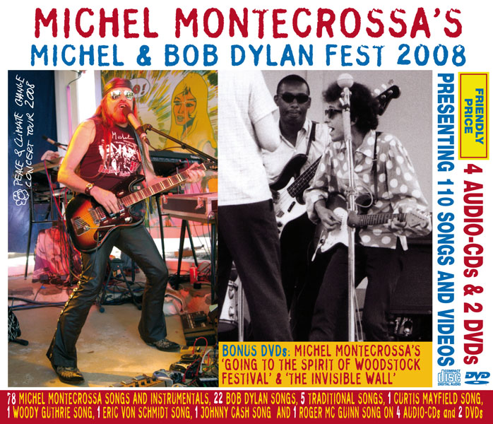 ‘Michel Montecrossa’s Michel & Bob Dylan Fest 2008’ released by Mira Sound Germany as Box Sets including 4 Concert Audio-CDs and 2 Bonus DVDs or alternatively 4 Concert DVDs and 2 Bonus DVDs, feature 78 Michel Montecrossa songs and instrumentals, 22 Bob Dylan songs, 5 Traditional songs, 1 Curtis Mayfield song, 1 Woody Guthrie song, 1 Eric von Schmidt song, 1 Johnny Cash song and 1 Roger Mc Guinn song as well as the Bonus DVDs ‘Going to the Spirit of Woodstock Festival’ and ‘The Invisible Wall’.