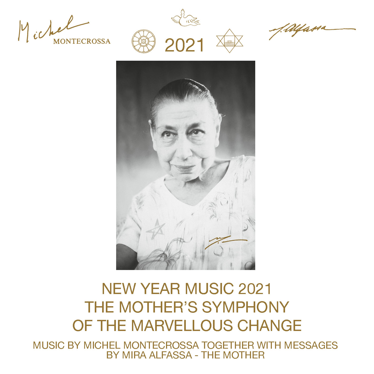 “The New Year Music 2021 ‘THE MOTHER’S SYMPHONY OF THE MARVELLOUS CHANGE’ is, together with the messages of Mira Alfassa – The Mother, revelation and experience music going all the way into a new body consciousness. It is music of great peace that unites spiritual and material feeling, soul and body.”