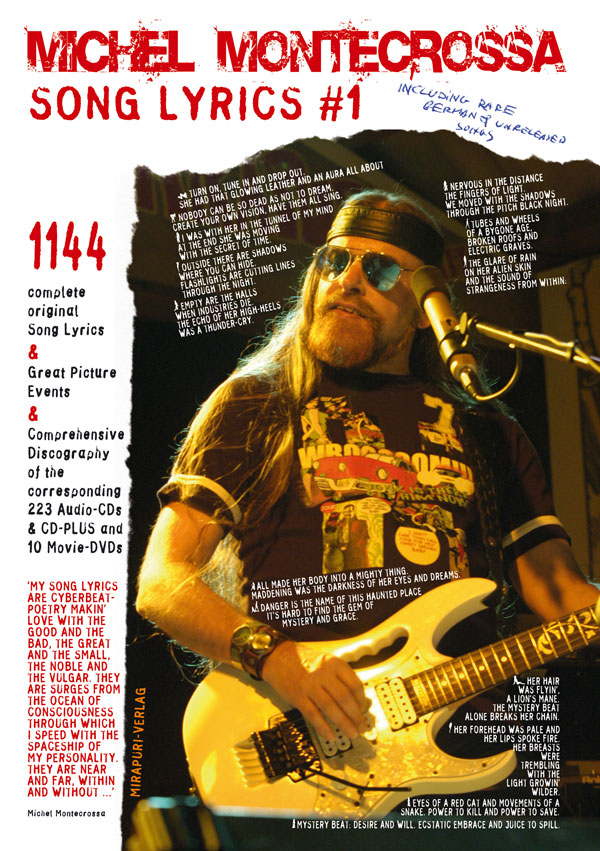 Michel Montecrossa ‘Song Lyrics #1’ published by Mirapuri-Verlag, features 1144 thrilling song lyrics from Michel Montecrossa’s gorgeous treasure of stunning and limitless creativity. Including rare german and unreleased songs.