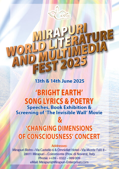The Mirapuri World Literature Fest 2022 presents Books, Audio and Movies dedicated to ‘POETRY & SPIRITUAL PHILOSOPHY FOR FUTURE’ by Sri Aurobindo, Mira Alfassa – The Mother, Michel Montecrossa and Mirakali in English and German language on Friday, 10th June 2022, 19:00 at the Omndiet Resort and Business Hotel in Mirapuri, Italy
