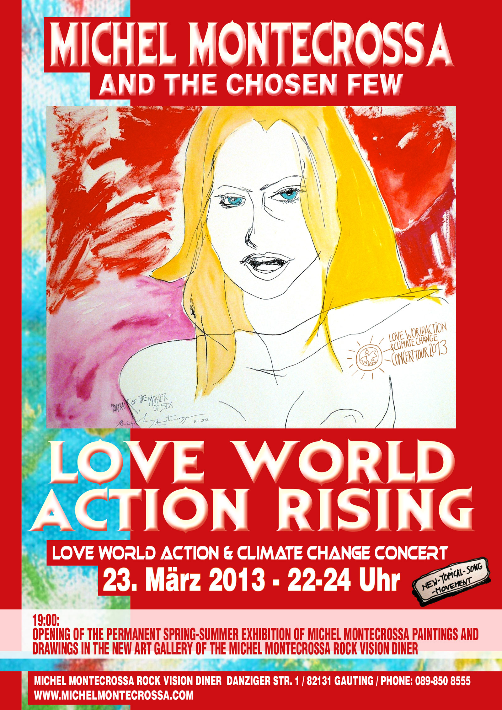 Unter dem Titel ‘Love World Action Rising’ präsentiert Michel Montecrossa gemeinsam mit seiner Band The Chosen Few die Aktualität auf den Punkt bringende New-Topical-Songs wie ‘Talking The Pope Needed’, ‘Talking New German Chancellor’ (New Topical-Song über Peer Steinbrück, Deutsche Wahlen & Eu-Krise), ‘Talking German Wahlgetöse, Or Who Is The Clown? (New-Topical-Song über Steinbrück-Steinreich, Diplomatie und Clowns), ‘Talking The German Chancellor I Want’, ‘Talking Media World’, ‘Here Are All The Answers’ und ‘Talking Love World Action For A Better Future’.