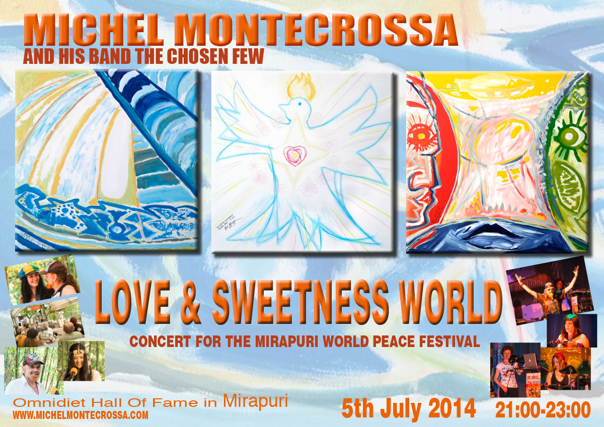 Michel Montecrossa together with Mirakali and Diana Antara play the ‘Love & Sweetness World’ Concert on 5th July 2014 in the Omnidiet Hall of Fame, 21:00 – 23:00.