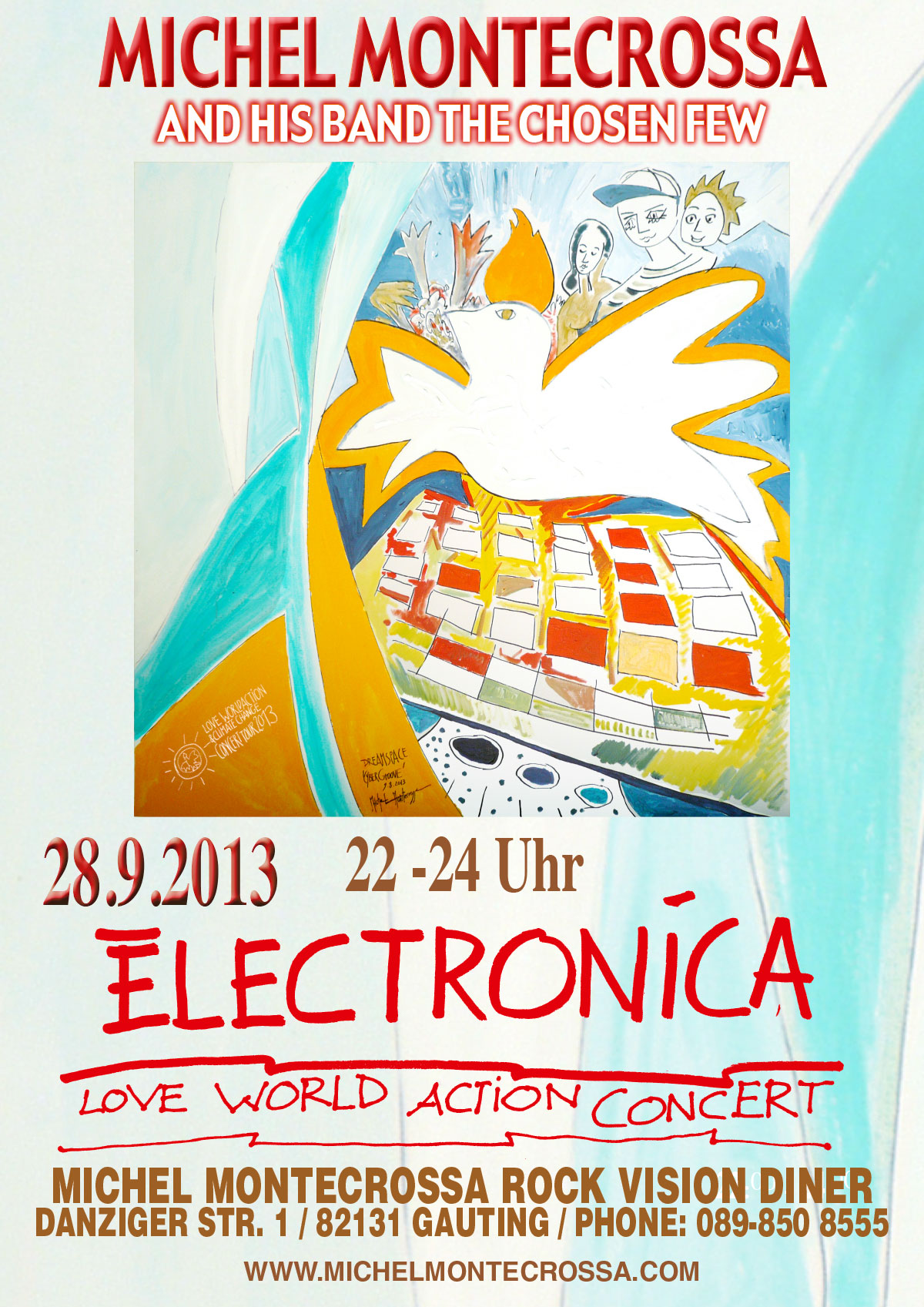 Michel Montecrossa about the Electronica Love World Action Concert and the songs he performs together with Mirakali and Diana Antara: “The songs I play together with Mirakali and Diana Antara at the Electronica Love World Action Concert are songs of Psyche and Eros that are like paintings moving in the Stream of Consciousness of Ideal Cybernetic Electronica. Our music is an adventure into the Future of the Bright Earth of Peace, Energy, Harmony and Joy. It is the Celebration of Humanity no longer falling back into terror, conflict, hate and darkness. We invite everybody to join this Celebration at the Electronica Love World Action Concert on 28th September 2013.