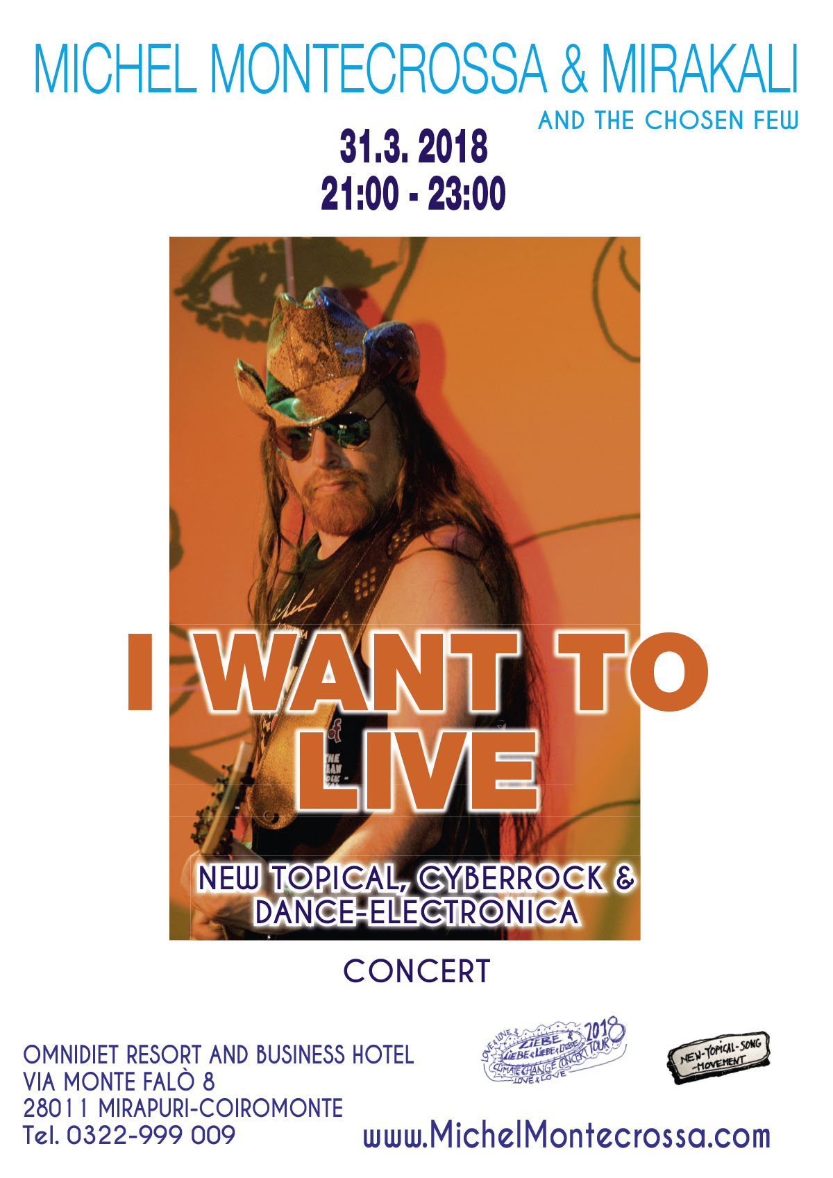 Michel Montecrossa together with Mirakali and The Chosen Few play the ‘I Want To Live’ New-Topical, Cyberrock & Dance-Electronica Concert on 31st March 2018 in the Omnidiet Music-Hall in Mirapuri triggered by the ’March For Our Lives’ in Washington DC.