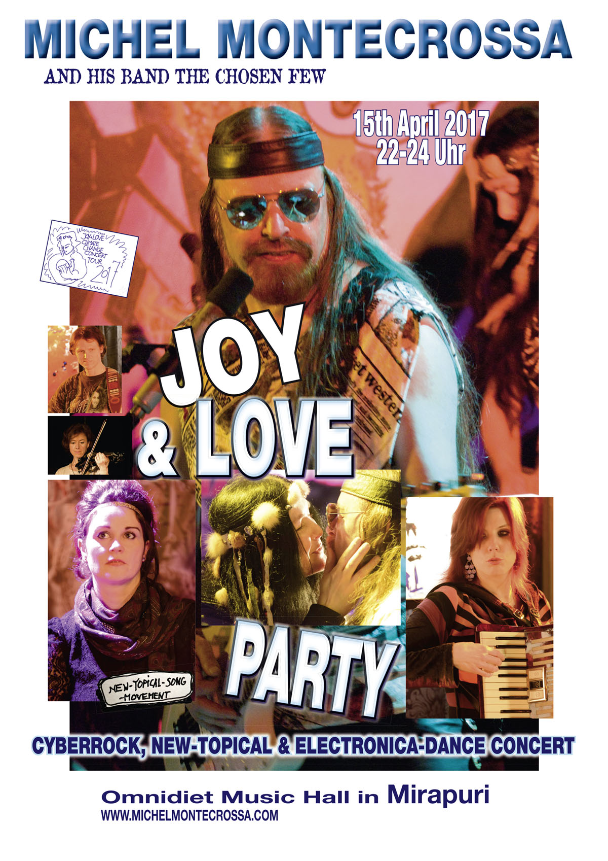 Michel Montecrossa together with Mirakali, Diana Antara and The Chosen Few plays the ‘Joy & Love Party’ Cyberrock, New-Topical & Electronica-Dance Concert on 15th April 2017 from 22:00 – 24:00 in the Omnidiet Music-Hall.