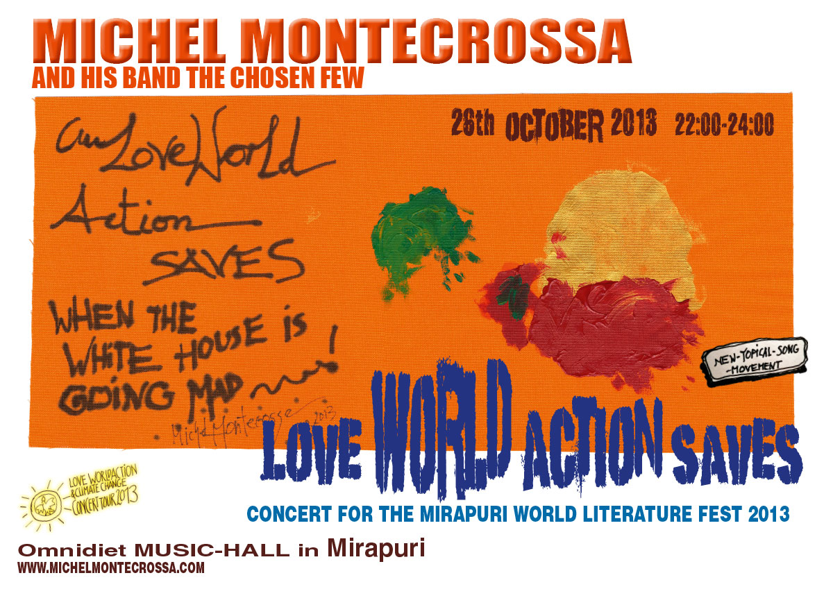 Michel Montecrossa together with Mirakali and Diana Antara play the ‘Love World Action Saves’ Concert on 26th October 2013 in the Omnidiet Music-Hall for the Mirapuri Literature Fest 2013. The Mirapuri World Literature Fest which takes place from 25th October till 27th October 2013 presents Love World Action in Literature, Movie, Art, Topical-Songs and Audio-Books. Also on 25th October 2013 is the opening of the CREATIVITY Exhibition of new Michel Montecrossa paintings and drawings in the Omnidiet Music-Hall. The CREATIVITY Exhibition presents new masterpieces of deeply touching impact, profundity, insight and vision created by the genius of Michel Montecrossa, one of the most outstanding 21st century modern universal artists.