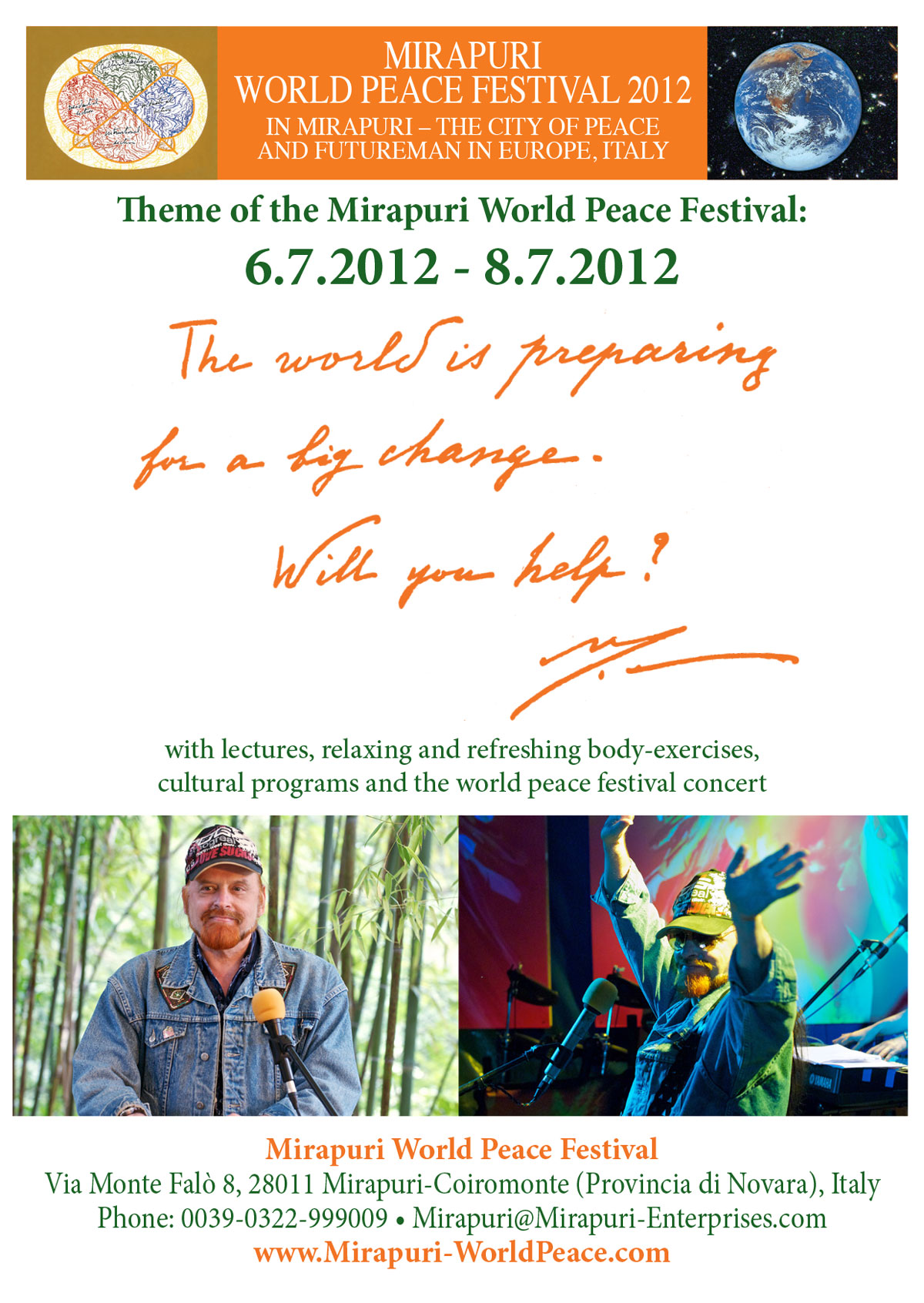 For tuning into the atmosphere of the Mirapuri World Peace Festival, its message, its poetry and its music see the recording of Michel Montecrossa’s speech for last year’s Mirapuri World Peace Festival: ‘The Future Is Young – Listen To The Young’. The recording features the complete speech combined with the live-performance of the six New-Topical-Songs: ‘Who Is The Future?’, ‘Talking Lines Of Fire’, ‘Secrets Of The Green World’, ‘Germany Is Green For The Future Of Europe’, ‘China Means Future’, ‘The United States Of Planet Earth’.