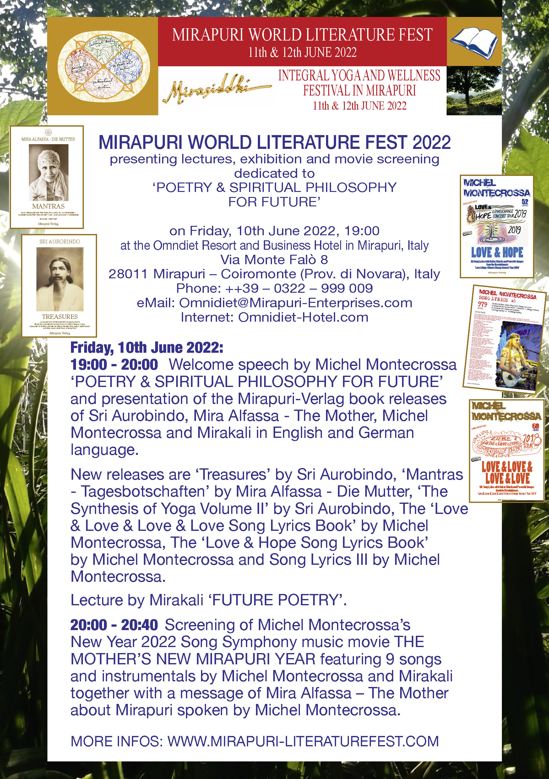 The Mirapuri World Literature Fest 2022 presents Books, Audio and Movies dedicated to ‘POETRY & SPIRITUAL PHILOSOPHY FOR FUTURE’ by Sri Aurobindo, Mira Alfassa – The Mother, Michel Montecrossa and Mirakali in English and German language on Friday, 10th June 2022, 19:00 at the Omndiet Resort and Business Hotel in Mirapuri, Italy