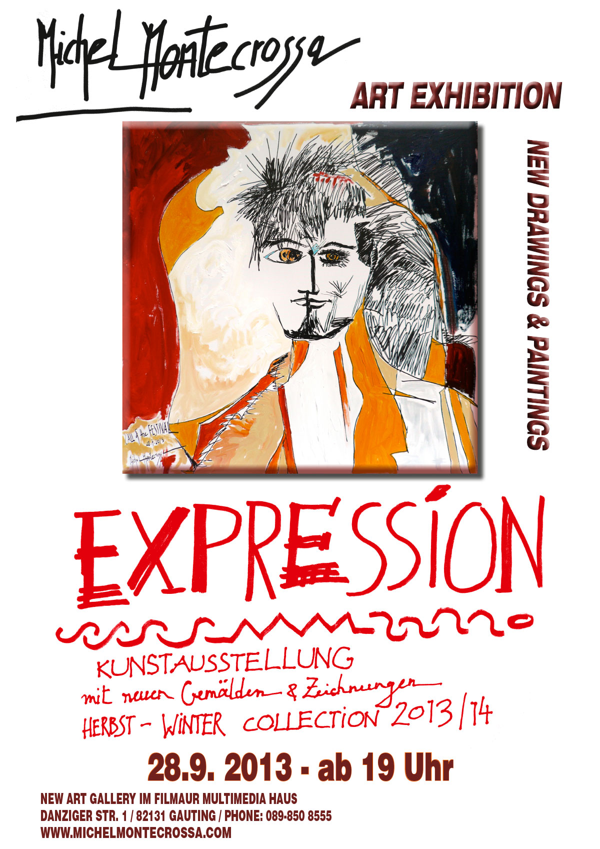 On 28th September 2013 starting 19:00 is the opening of the Expression Art Exhibition of new Michel Montecrossa paintings and drawings for the Autumn-Winter season at the New Art Gallery of the Filmaur Multimedia House, Danziger Str. 1, Gauting near Munich, Germany, Phone ++49-89-850 8555. michelrockvision.com/#gallery